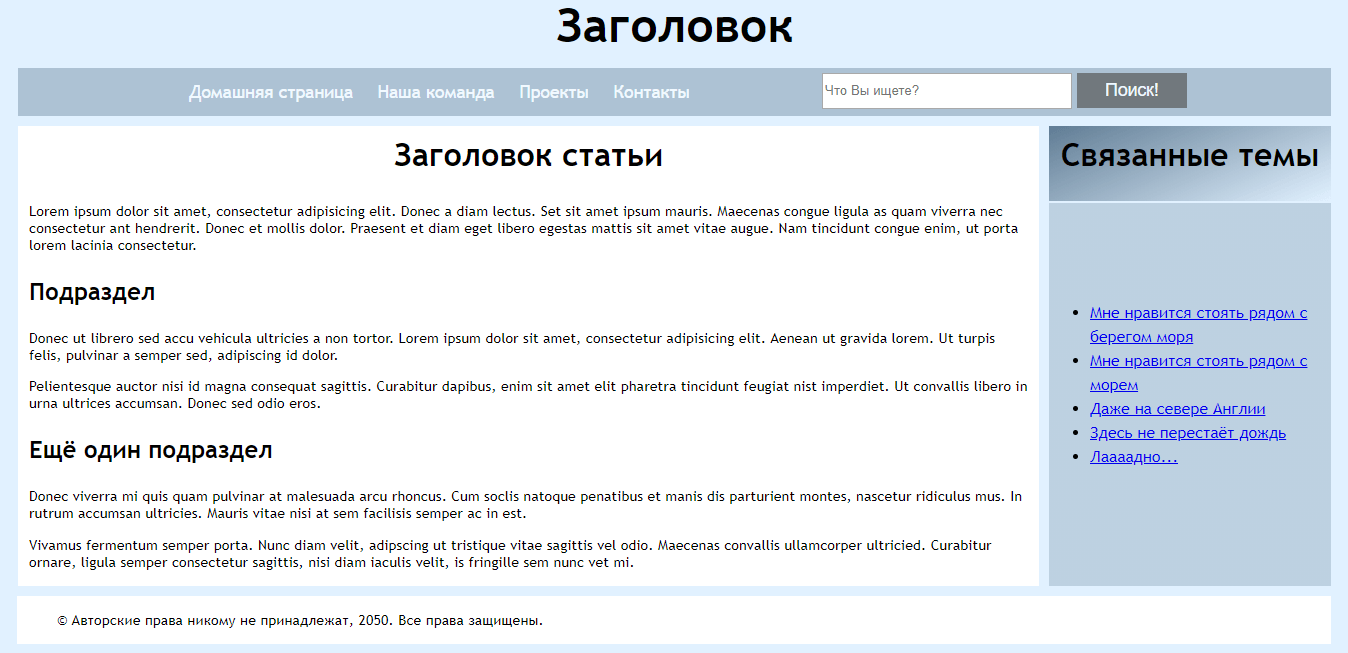 Для реализации такой семантической разметки HTML предоставляет выделенные теги, которые можно использовать для создания таких разделов, например: